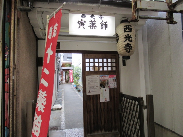 間口は狭くわかり難いかもしれませんが「寅薬師」との書いてあって西光寺との提灯が吊りされていますのでわかると思います。西光寺の通称寅薬師と呼ばれ安置されている寅薬師如来像は弘法大師の作と伝えられているほどで歴史があります。無病息災、病気平癒に御利益があり、特に寅年生まれの守護佛として信仰があります。