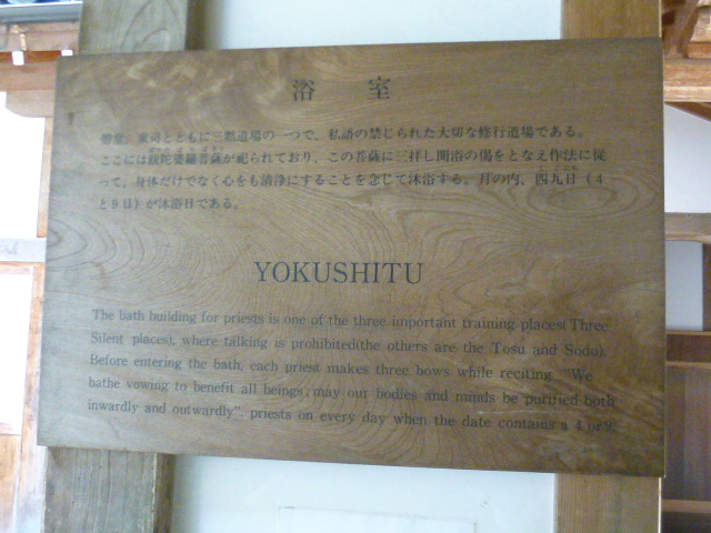 約70の諸堂があるようですが、「浴室」は日常修行される重要な建物である七堂伽藍(しちどうがらん)のひとつです。仏殿を中心に囲むように回廊がありその東南に浴室はあります。