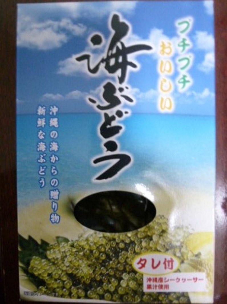 それと海ぶどうも有名ですが、その辺で売っているのは日持ちが約1週間ですが、ここでは賞味期限が約2ヶ月、タレ付きで、液体の袋に入って箱入りです。