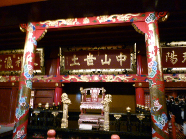 正殿は首里城で最も中心的な建物で主に国王が政治や儀式を執り行う場です。建物は三階建で内部見学できますが、靴を脱いで南殿から正殿へと見学するようになります。