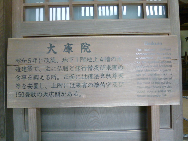 約70の諸堂があるようですが、「大庫院」は日常修行される重要な建物である七堂伽藍(しちどうがらん)のひとつです。仏殿を中心に囲むように回廊がありその東に大庫院はあります。