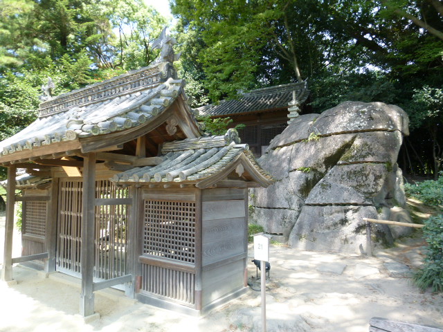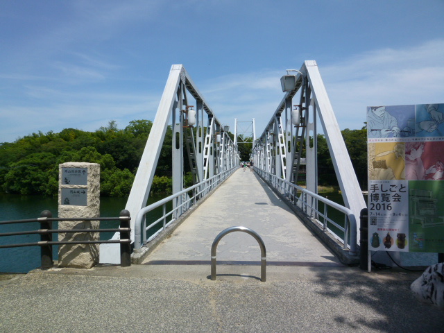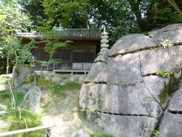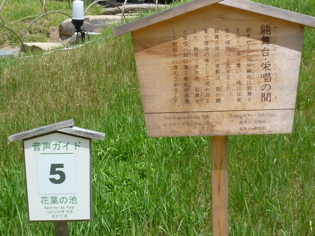 今日は日本三名園のひとつである岡山後楽園を散策しています。そして花葉の池の前に来ています。そこに「能舞台・栄唱の間」と書かれた看板が建っています。建物はどれかな、パンフレットの地図をを見ると池の向かいの上にある建物で、手前が栄唱の間で奥が能舞台です。栄唱の間は能の見所や接待の場として使われ、能舞台では池田綱政能が能を振る舞っていたようです。現在の建物は復元ですが現在も定期的に開催されています。ここからは花葉の池がちょっと下に見えその風景が良いですね。蓮に花が咲いたらもっといいと思います。