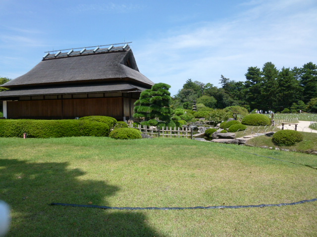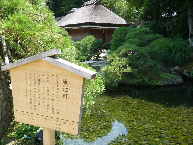 今日は日本三名園のひとつである岡山後楽園を散策しています。岡山城から月見橋を渡って南口から後楽園に入りましたが、入口付近はちょっと高くなっていて、ここから見る後楽園の絶景には驚きです。そしてその右側に「廉池軒」はあります。あぁー藁ぶき屋根ですね素晴らしいです。戦災をまぬがれた建物とは聞いていましたが今も風情ある姿を残しています。また池に架かる橋も良いですね、石橋です。渡ることはできませんが、これもあまり観れるものではありません。横には休憩所らしき場所があります。素晴らしい後楽園です。