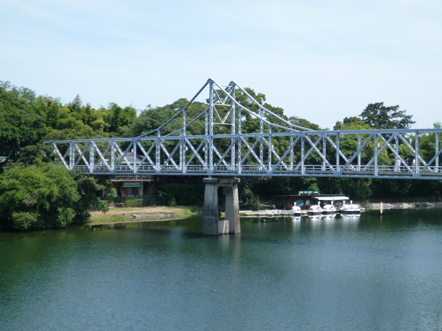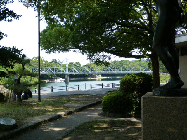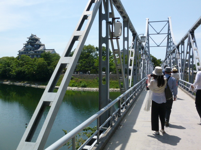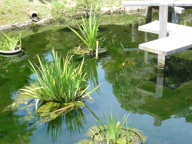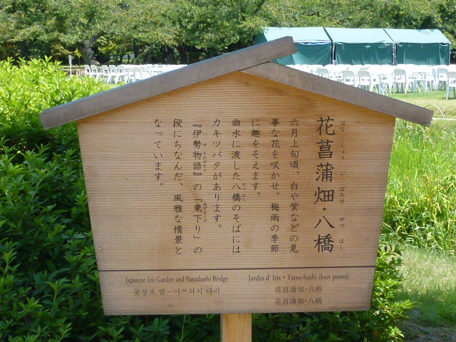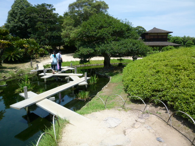 今日は日本三名園のひとつである岡山後楽園を散策しています。そして流店付近を歩いていると「花菖蒲畑 八橋」との駒札が立っていてその説明がされています。園内を流れる曲水に八橋、8個の板が置かれそこが歩道となっています。そこを歩いてみました落ちない様に注意してくださいね。曲水には「カキツバタ」があり。また付近には花菖蒲畑もありましたが、いずれも6月の梅雨時の花なので花びらはありませんでした。残念です。きっと季節には美しい花が咲くことでしょう。後楽園は四季折々の風景が見れますね。