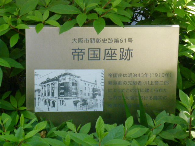 今日は大阪・御堂筋付近を散策しています。そしてこの付近に帝国座ってのがありその「帝国座跡」の碑があるとの情報を得たので行ってきました。会社名でしょうか、Schneider Electric、の看板がありその左下に寂しく記念碑はありました。帝国座は、日本最初の洋風劇場で1910年に開場、オッペケペー節で有名な川上音二郎の活動拠点であったとのことです。オッペケペー節?名は聞いたことはありますが詳しくはしりません。YOU Tube で発見、観れますよ。一度見て楽しんでくださいね。