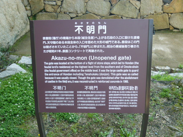藩主の住居である御殿などがある本段には上級しか入れなかったため、この門は閉ざされていることが多かったようです。そこから不明門(あかずのもん)との名が残っているようです。廃城令で取り壊されましたが、1966年の再建されました。さぁー本段へ入って天守へと行きましょう。- 旅行時期