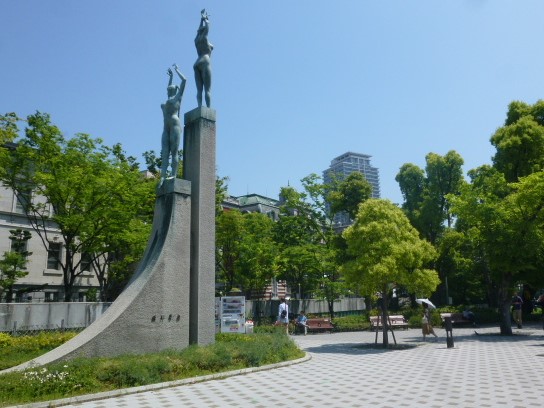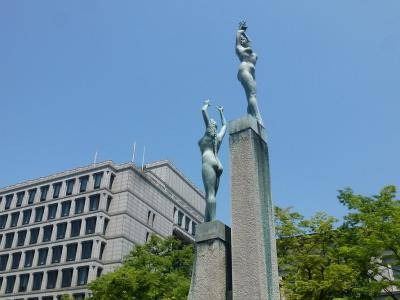 今日は大阪中之島をぶらーとしています。表示板に三好達治さんの歌碑があるとのことなので行ってきました。場所は中央図書館の南側に「緑の賛歌」と言う塔がありますが、その東側で栴檀木橋の下付近の緑地の中にあります。ちょっとわかりにくいですがその気になればわかると思います。三好達治さん?あまり知りませんでした。歌碑のタイトルには「乳母車」、母よ――淡くかなしきもののふるなり紫陽花・・・と書かれています。紫陽花の道を乳母車を押す優しい母の姿が浮かびますね。