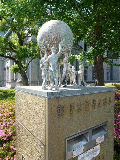 今日は大阪中之島を散策しています。その中にはレトロな建物や史跡が残っています。日銀大阪支店前にある「駅逓司大阪郵便役所跡」もそのひとつです。今は誰でも利用する郵便はいつ頃からできたのでしょうか、江戸時代は馬や飛脚でしたよね。はじまりは明治4年、東京から大阪間で郵便業務が開始され、大阪側は島原藩蔵屋敷があったこの場所に役所が置かれポストもあったようです。その記念碑なのですね。横には「郵便は世界を結ぶ」ポストが設置されています。合わせてご覧なってくださいね。