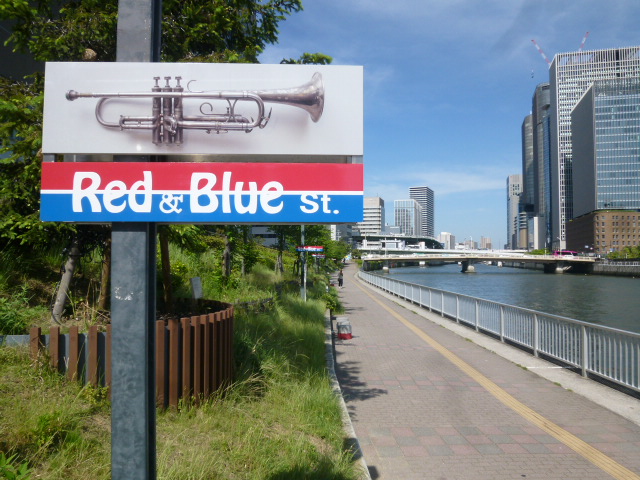 今日は大阪中之島を散策しています。堂島川沿いを田蓑橋北詰から西方向に歩いていますが、「 Red & Blue St 」と記載あるおしゃれな街路灯が印象的です。珍しいですね横文字です。後で調べてみると、ジャズミュージシャンである手嶋祥一さんが率いるバンド名の「Red&Blue echo」から付けたようで、関西を拠点に活動されていてかなり高齢の方のようです。遊歩道は緑化など綺麗に整備されベンチもあります。夕刻にはここから観るライトアップされた橋々やビルを鑑賞することができるでしょう。トランペットの音色は響いているのでしょうか。訪れてくださいね。