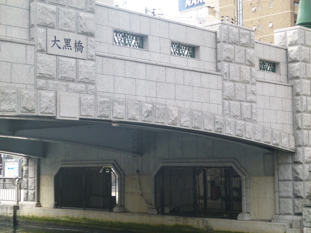 道頓堀川沿いを道頓堀橋から西へ散策しています。「新戎橋」の西に架かる橋が「大黒橋」で、雰囲気はころっと変わり、ぶ厚そうな石橋がどっしり感を与えてくれます。北はアメリカ村付近でしょうか、そして「なんばHach」にも近いですね。道頓堀川に架かる橋の中で一番迫力ある橋です、気に入りました。ここも一方通行です。