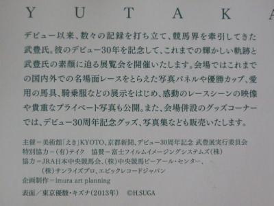 京都駅伊勢丹の7階にある美術館「えき」KYOTOで開催している騎手武豊のデビュー30周年記念「武豊展」に行ってきました。~名馬と共に歩んだ30年~と題し、5月27日から6月12日まで開催しています。展示品は国内外でのレースの写真や優勝カップや盾、勝負服などを展示、またイチローとのサイン入りの写真など幅の広さをうかがえます。また出口後にはTシャツやアクセサリーなど関連商品を販売しています。会場内は写真撮影禁止です。12日まで開催していますので訪問くださいね。有料です。