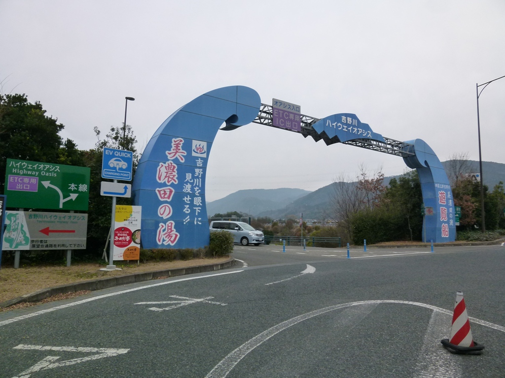 ここは徳島自動車道、今四国をドライブしています。徳島から西方向に走行です。安全運転のために「吉野川サービスエリア」で休憩をとります。横には吉野川が流れていて、とても環境の良い場所にあります。吉野川への遊歩道もあります、季節の良い時期には様々な草花が咲き素晴らしい行楽の場所になることは間違いないでしょう。吉野川を眼下に温泉もあるようです。また吉野川ハイウェイオアシスもあるようです。行ってみましょうか。