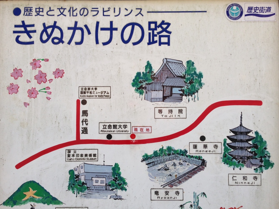 京都で有名な観光地でに金閣寺がありますが、その付近を走っている「きぬかけの路」があります。「きぬかけの路」の語源は、衣笠(きぬかけ)山の路として、きぬかけ(衣笠)の路、となっています。全長約2.5kmで金閣寺から龍安寺、仁和寺と続いています。この3つの世界遺産を結ぶ観光道路です。徒歩で約3分で途中カーブや坂道がありますので注意してくださいね。ジョギングしている方も見かけました。等持院やわら天神などもあり見どころが多いコースです。たっぷり時間を掛けて散策するのもいいでしょう。