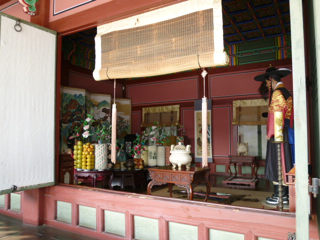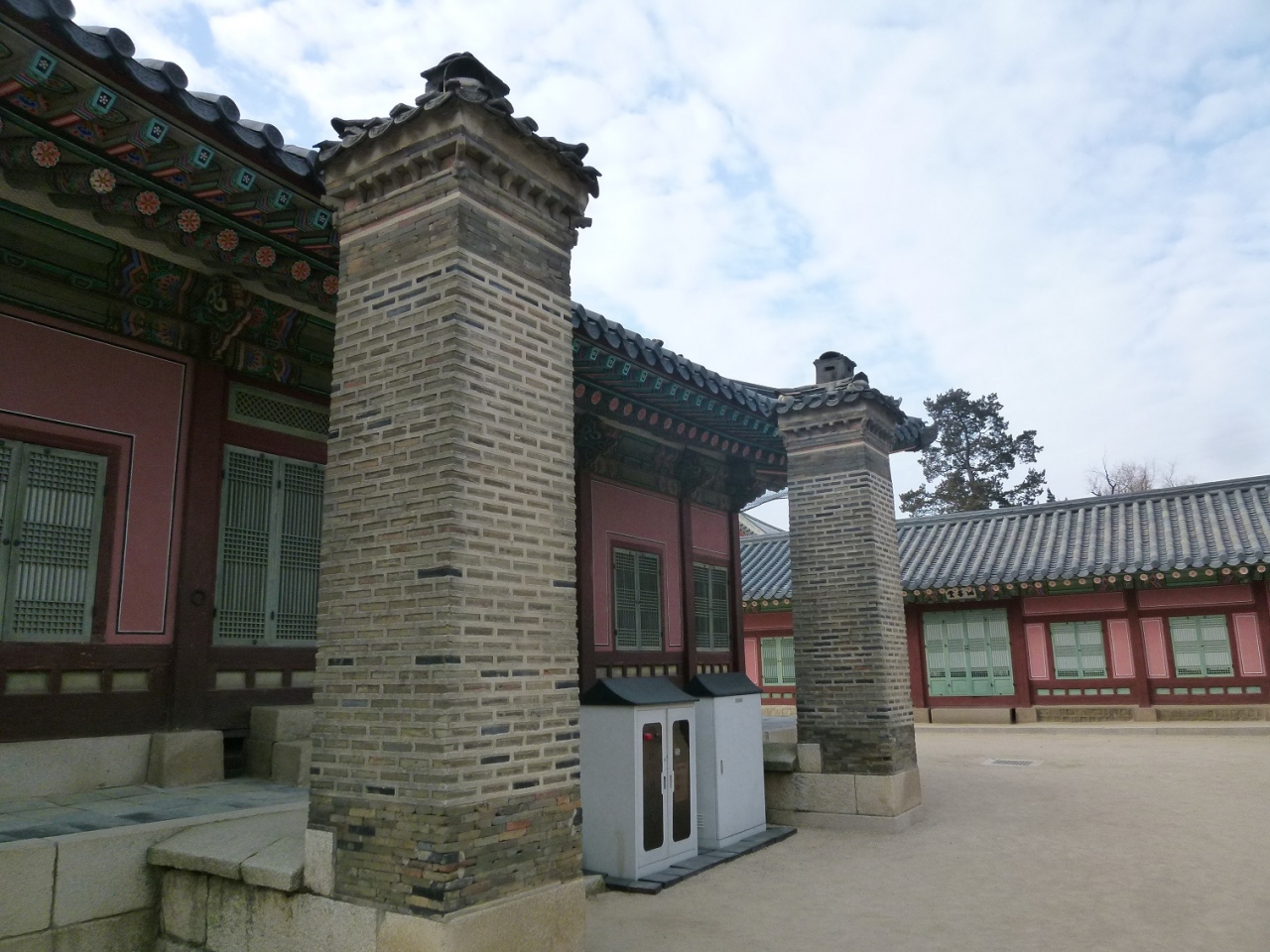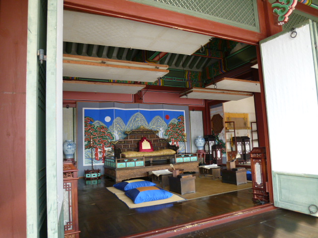 今回は韓国・ソウルを旅し「景福宮」に来ています。光化門で王宮守門将交代儀式見学し3000ウォン(約300円)を支払って、入場口である興礼門から中へ、「勤政門」を通って景福宮の中心である「勤政殿」にきました。ここは世宗大王の即位儀式などが行われた場所で、国宝に指定されています。中を覗いてみると、王様が座るにふさわしい椅子がありその背景には太陽と月が描かれています。この世は輝かしく太陽と月が出て安泰であると言うことを込められているのでしょうか。さぁー奥へ進みましょう、まだまだ見どころがあります。