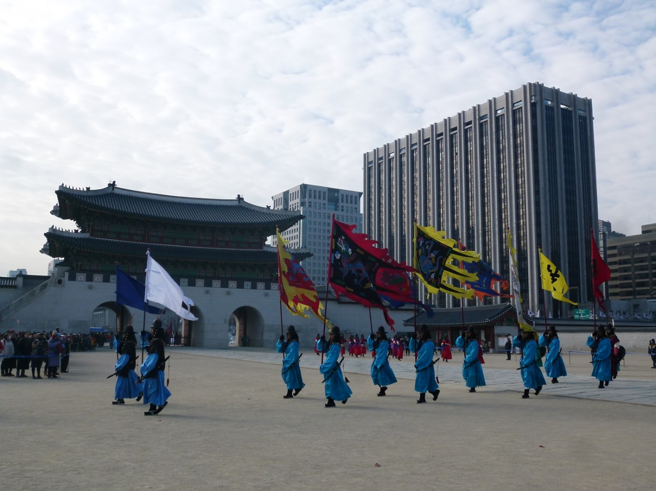 今日は韓国・ソウルを旅しています。地下鉄で安国で下車したので「光化門」の前付近ではなく、東側から中へ入りました。「景福宮」へ到着したのが丁度10時で運よく王宮守門将交代儀式をやっていました。場所は「光化門」と「興礼門」の間です、景福宮内への入場券はここで購入です。3000ウォン(約300円)だったと思います。さぁー中へ入ってみましょう。日本の城とは異なり、まるで中国の紫禁城を思わされます。とにかく広いですよ。出口は「国立民俗博物館」方面への方が良いです、無料で観覧できます。