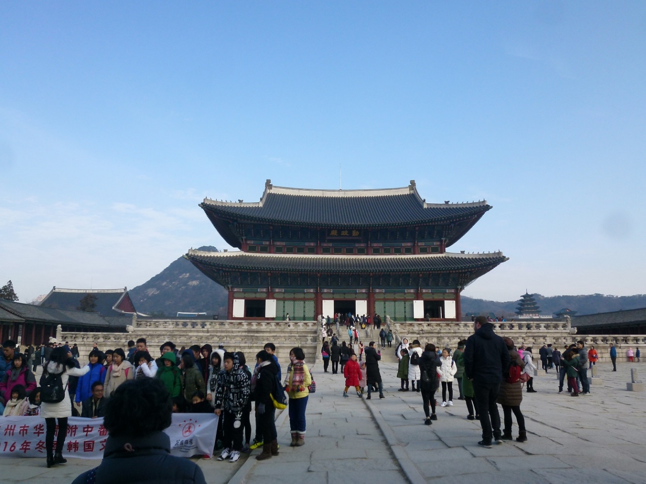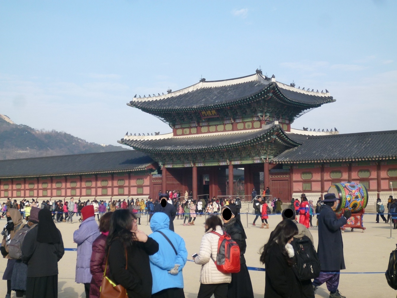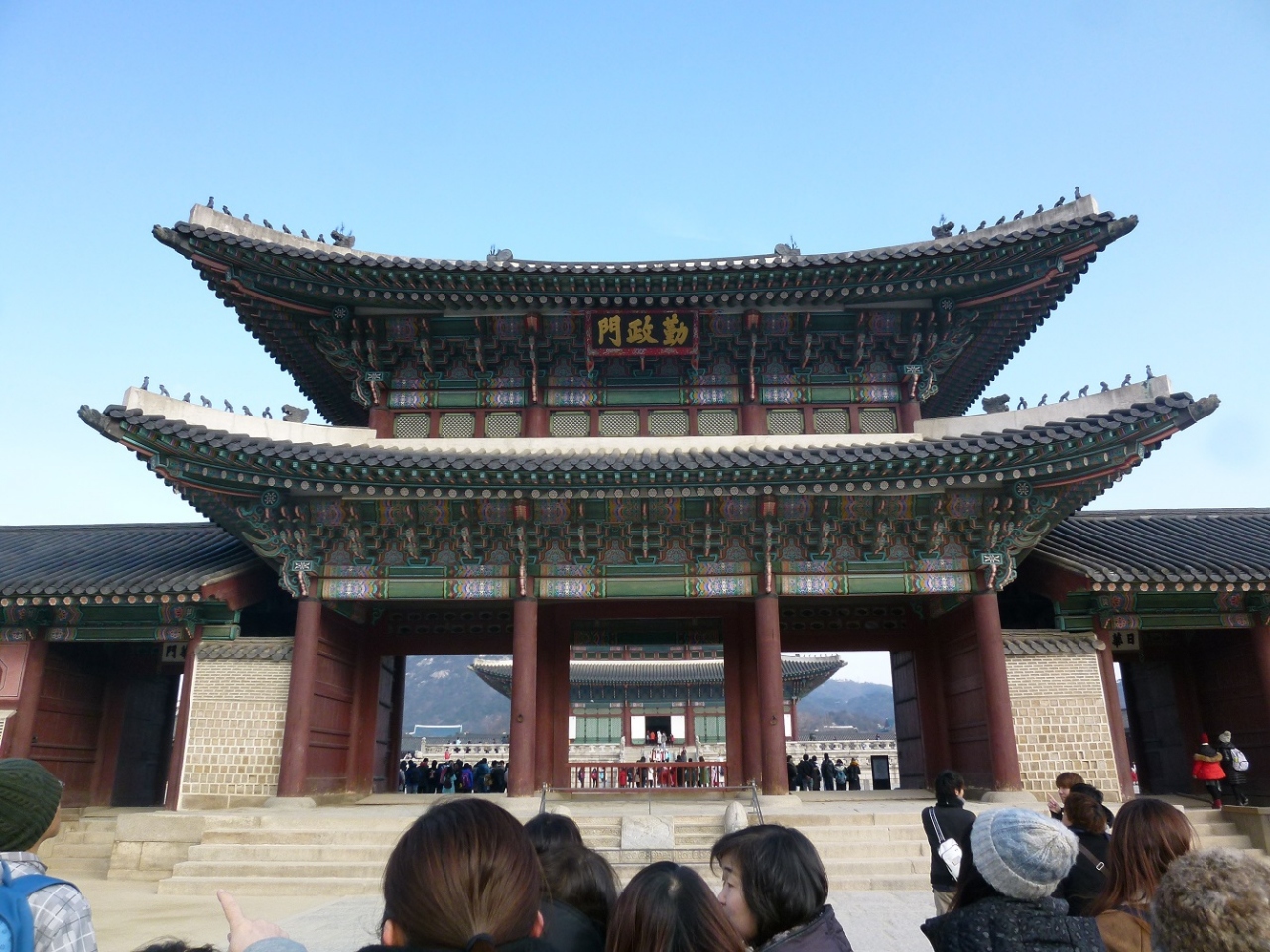 今回は韓国・ソウルを旅し「景福宮」に来ています。光化門で王宮守門将交代儀式見学し3000ウォン(約300円)を支払って、入場口である興礼門から中に入ります。そこには、またまた大きな門があり、これが「勤政門」で「景福宮」の正門に当たるところです。これから先が「景福宮」のメインとなるところですね。奥には世宗大王即位儀式などが行われ、国宝に指定されています「勤政殿」があります。雄大な光景ですね、しかしソウルの冬は寒いです、手前にある永済橋の川が凍っていましたよ。また、日本語無料ガイド案内(10:00、12:30、14:30)があります。時間を合わせて利用してはいかがでしょうか。