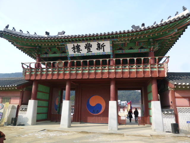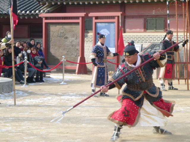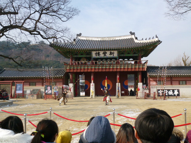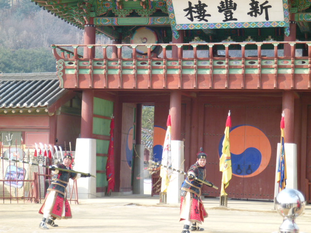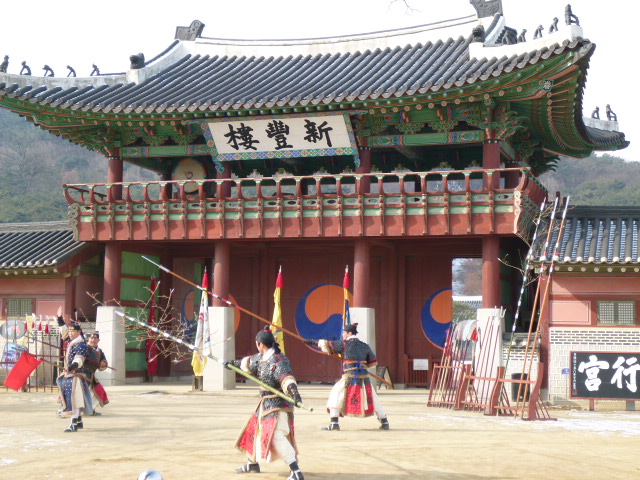 ソウルから地下鉄で水原駅へ移動、八達門へはタクシーを利用し、そして城内中央付近にあるここ「華城行宮」を散策です。ひと気も少なく撮影のセットのように簡単な建物のように見えます。入場無料です。ひと通り見回って帰ろうとすると、この中でもしっかりした正門の前でイベントをやっていました。剣などを用いた力強く戦い合っている演技しています。これを見ると韓国らしさが出てきますね。他にも「華虹門」、そこを流れる水原川は風情があるます。周遊する華城列車もあります。楽しんでくださいね。