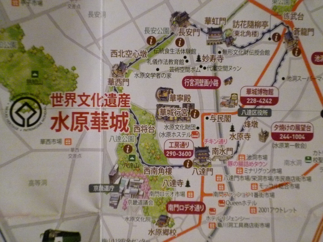 ソウルから地下鉄で水原駅へ、そして八達門へ行くのですが、歩いてはちょっと遠いし、バスは乗り方わからないし、思い切ってタクシーに乗車です。安いし良いかぁー10分ぐらいで到着です。八達門は「水原華城」の入口のようです。ちょっと変わった形をしていますね。水原駅で入手した観光図を見ながらスタートです。まずは中心付近にある「華城行宮」に行きますが、他にも「華虹門」、そこを流れる水原川は風情がありますよ。また、周遊する華城列車もあります。楽しんでくださいね。