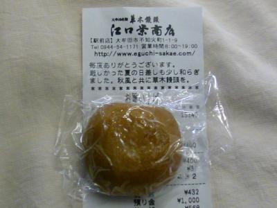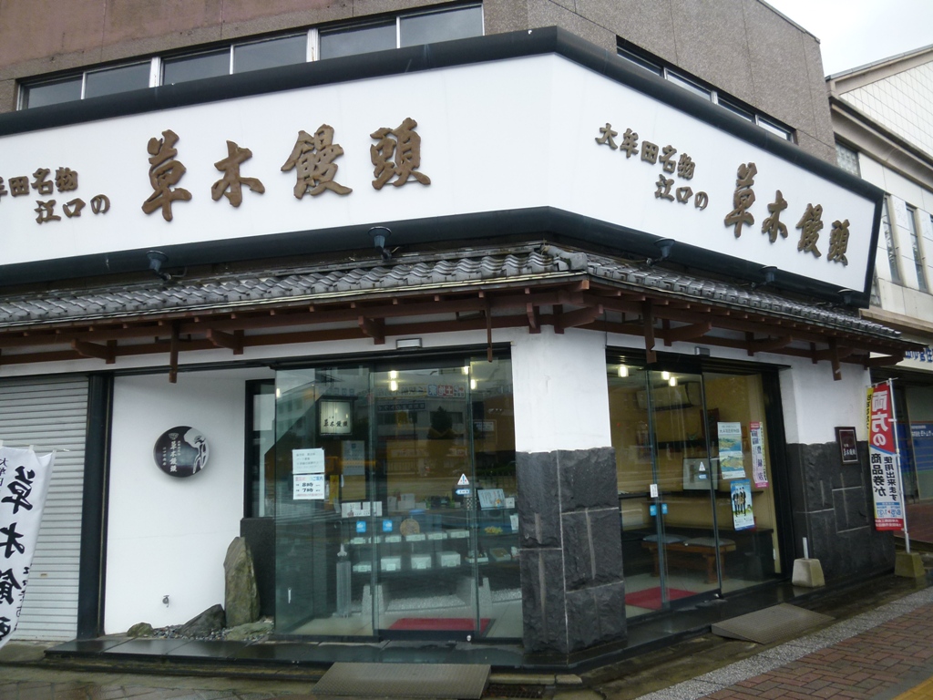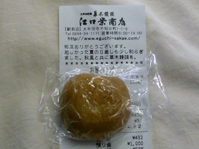 大牟田の名物と言えば「草木饅頭」があります。市内に数店あるようですが、1~2個食べようと思い、ここ大牟田駅前の角にある江口さんの店に入りました。バラ売りしているのかなぁーとみてみると試食の饅頭が置いてあってそれをゲット、なので1~2個買うのも奥がましくなって、10個入りを購入です。さらにもうひとつ試食もゲット。サラリーマン風の隣の方は50個入りを買っていました。もちろん試食もゲットです。