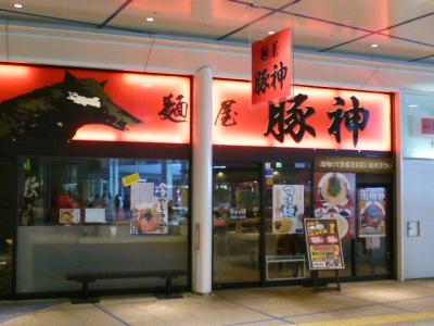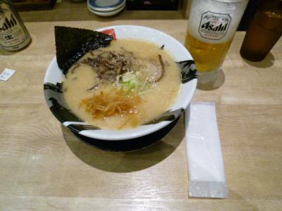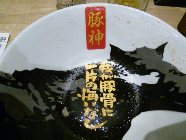 さぁーお腹もすいて食事の時間もとっくに過ぎています。ここは「オアシス21」食事するところはたくさんあります。数名のお客さんが入っているラーメン屋があり入店です。店の名前は初めて聞く「豚神」、豚骨ラーメンの美味しそうな名前です。注文は自動販売機でチケットを購入です。注文はいつものようにラーメンとビールです。スープまで全部いただき、どんぶりには「我が豚骨に一片の悔いなし」の文字が現れてきます。力はいっています、美味しかったですね。