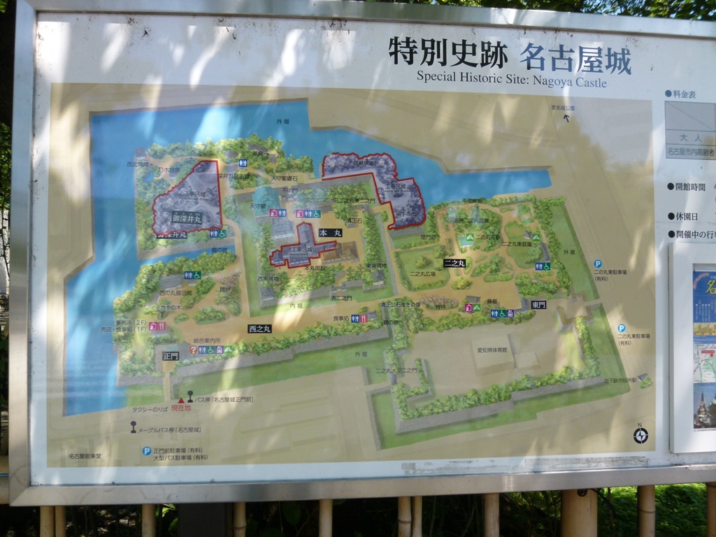今日は名古屋城の散策です。「観光ルートバス メーグル」に乗車し目の前まで来ましたが、この方法が一番便利なのでしょうか。徳川家康が1619年に19年の年月をかけて築城、九男義直が入城したとのこと、歴史ある城です。城内は、西之丸エリア、御深井丸エリア、本丸エリア、二之丸エリアの四つのエリアに分かれています。入口は、二之丸エリアの東門もありますが、西之丸エリアの正門から入って行きます。本丸御殿は修復中とのことですが、見学でーす。入場料は500円さぁー入りましょう。有名な鯱がみれますよ。