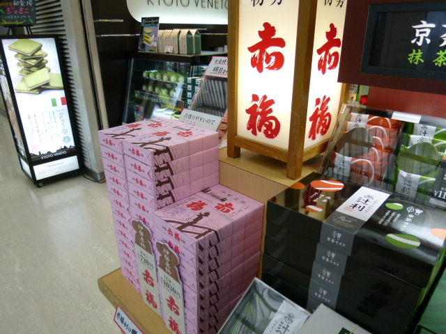 京都駅には、JRと近鉄が乗り入れていますが、ここ「近鉄名店街 みやこみち」は、上に近鉄の駅があり、その下の近い所にある商店街です。土産屋さんはもちろん中華料理店や和食店などのレストラン、コンビニもあります。もちろん赤福も置いてまーす。通路として活用している方も多いですね。エアコン効いて良いですからね。ポルタより利用しやすいと思いますね。