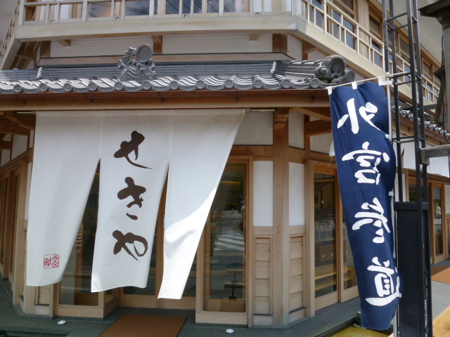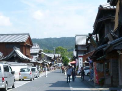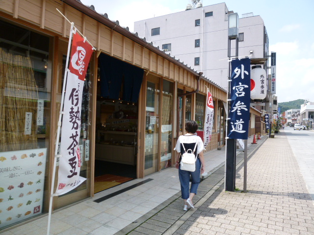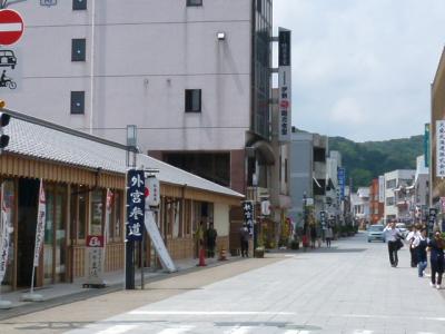 今日は伊勢市の観光です。伊勢市駅から外宮まで、この「外宮参道」を通って外宮へいきます。参道の両脇には様々な店舗がならんでいます。海産物販売の鈴木水産、練り物の若松屋、そして有名な赤福、楽しんでんくださいね。道幅は広く外宮からの一方通行です、車がきますので歩行には注意くださいね。