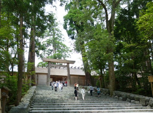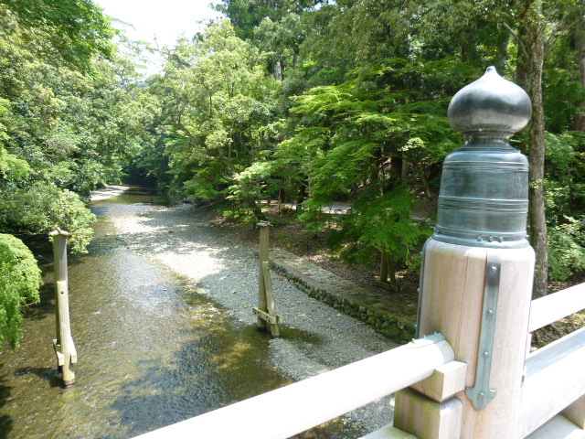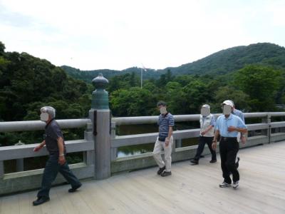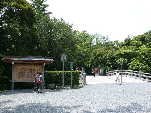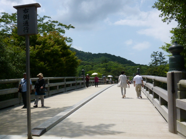 今日は伊勢神宮の散策です。まずは外宮の豊受大神宮を参拝し、バス移動でここ内宮の皇大神宮の参拝です。中に入るとまずカッコイイ宇治橋があります。あれー「宇治橋}? 確か京都の宇治橋と同じ? と思われる方は少なくないでしょう。規模は小さいですが流れている「五十鈴川」は清らかで、雰囲気バツグンです。さぁー渡って右に進んで行きましょう。正宮まではちょっと距離がありますよ。がんばりましょう。