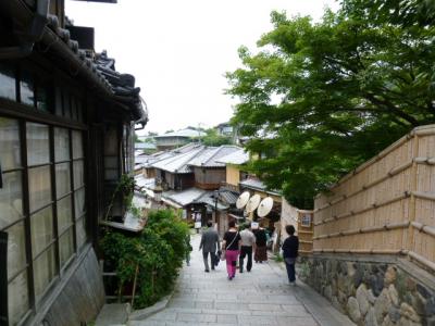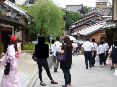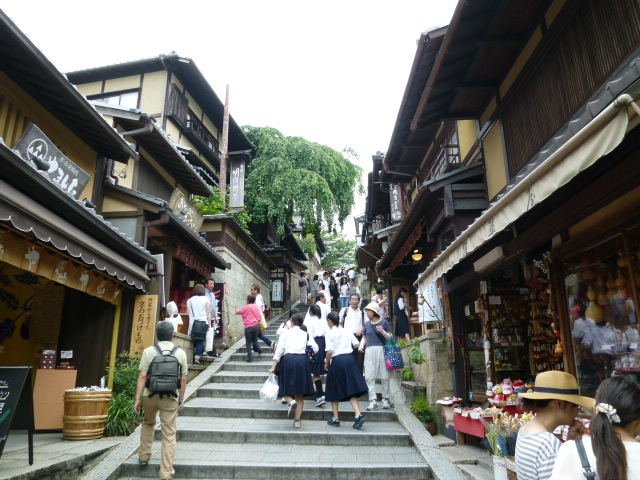 京都観光の中でも人気がある場所です。円山公園付近から清水寺へ、またはその逆のコースは東山の散策モデルコースと言ってもいいでしょうね。ここ東山は坂道が多いですよ。円山公園方面から来ると一年坂・二年坂、そして三年坂となり、清水寺方面へ行くと清水坂や五条坂などもあります。この三年坂も観光客で賑わっています。二年坂より多い気がしますね。大きな声を出し、アイスクリームなどを食べ歩きしている、よそからの観光客が大勢歩いています。気を付けてくださいね。京都らしい街並みを楽しく散策しましょう。