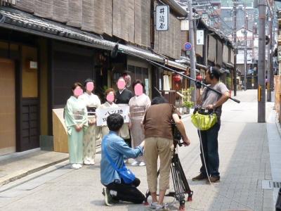 今日はぶらりと祇園を散歩しています。ここは京都らしき、いや日本らしき街と言えるでしょう。これを観たさに、世界中の観光客が訪れています。路地の両サイドには、お食事処などが並んでいますが、夜になると我々が入ることが出来ない「一見さんお断り」の華やかな世界が展開されるのでしょう。ここ祇園は、散歩するだけで日本人としての喜びを感じるのは、私だけではないでしょう。ちょっと路地に入ると落ち着いた雰囲気があります、八つ橋のCMでしょうか、撮影している場面にも遭遇しました。