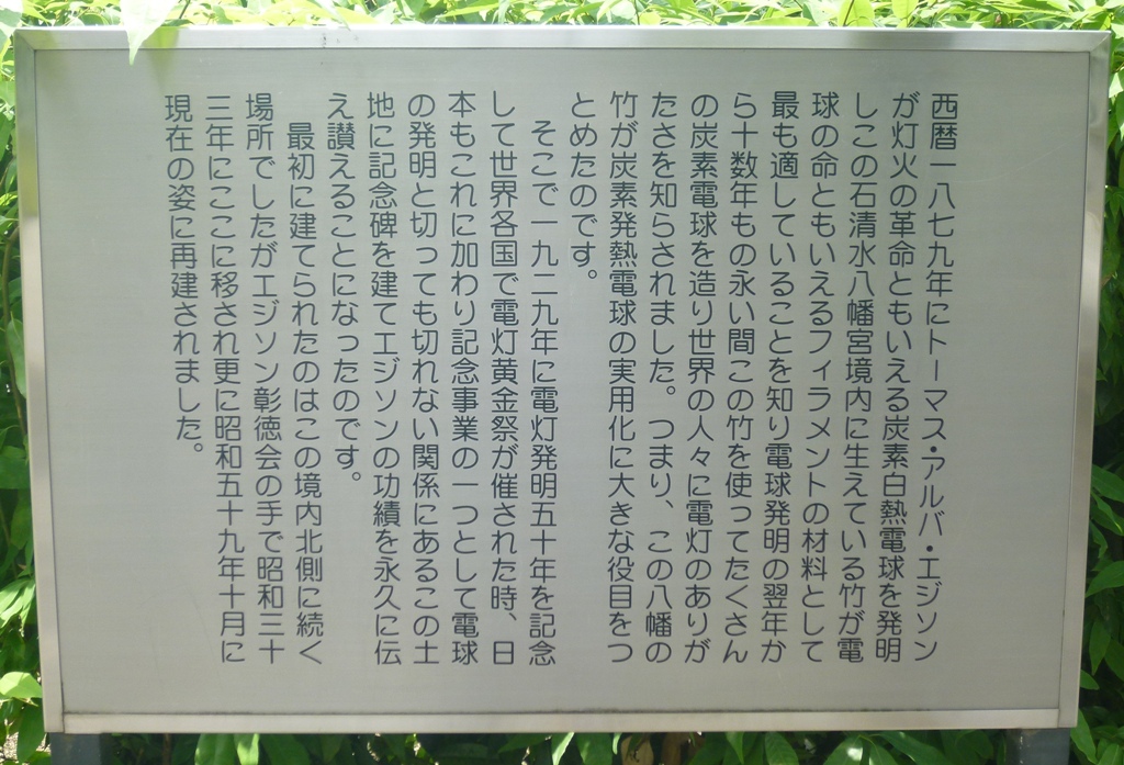 今日はこの男山と周辺を散策します。京阪八幡市駅下車、山頂へは片道200円のケーブルカーです。出て石清水八幡宮への順路は一般的に右方向に行きますが、眺めの良い所と表示されている正面の階段を登りました。そこには谷崎潤一郎の碑がある絶景展望台があります。また、有名な竹細工を販売、カブトムシを一点購入です。八幡宮観光もいいのですが、山頂には竹のフィラメント電球の発明者エジソンの記念碑もあります。見どころ多い、男山、です。参道を歩いて登ると体力がいりますが、ケーブルカーを利用するとハイヒールでも行けますよ。是非訪れてください。