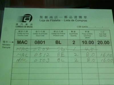 今日はマカオの観光です。やはりセナド広場付近が一番人気なのでしょうね。大勢の観光客です。ここ郵政局に昨日きたのですが休日で休み、再び今日来ました。館内は重厚な建物で現役の郵便局です。目的は切手を購入することです。館内には様々な切手とその価格が展示されていて、用紙に番号と金額を記入し購入するシステムになっています。しかし残念、お目当ての切手は売り切れのようです。また今度にします。気に入った切手があれば購入してくださいね。