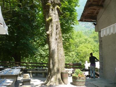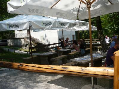 石と木のテーブルとイスです。私たちが食べ始めるころには、満席になってい...