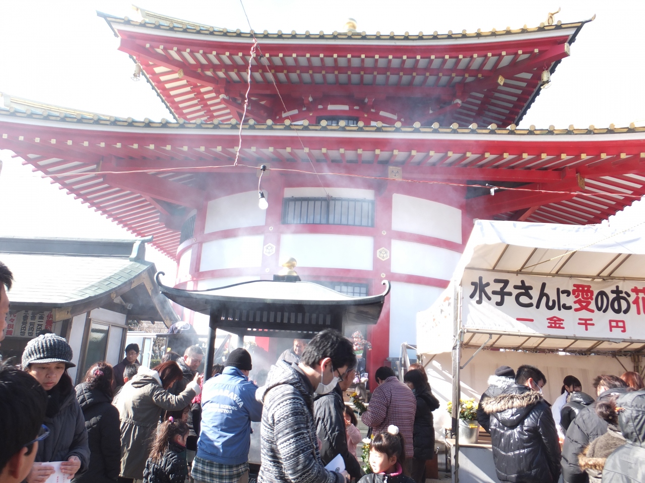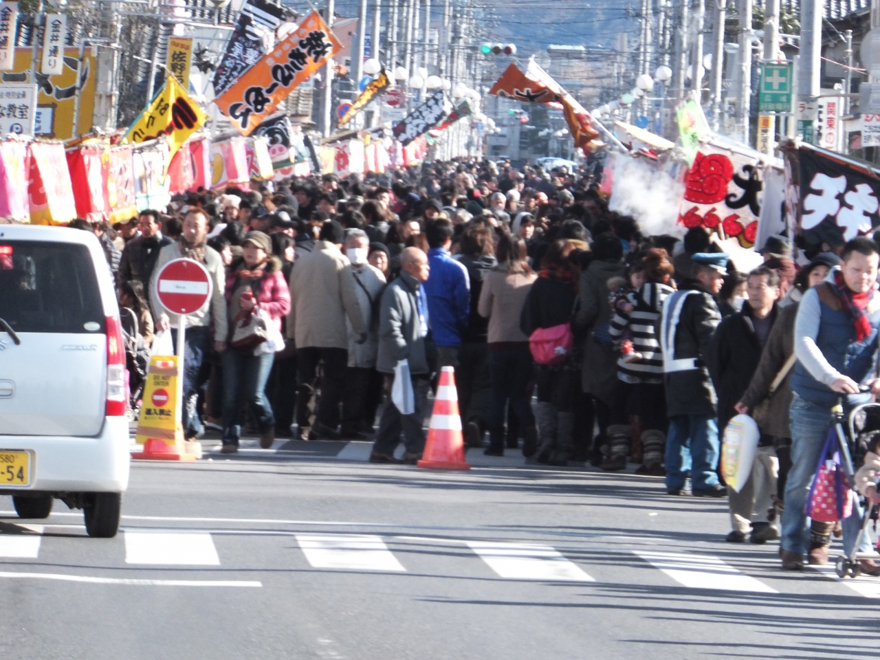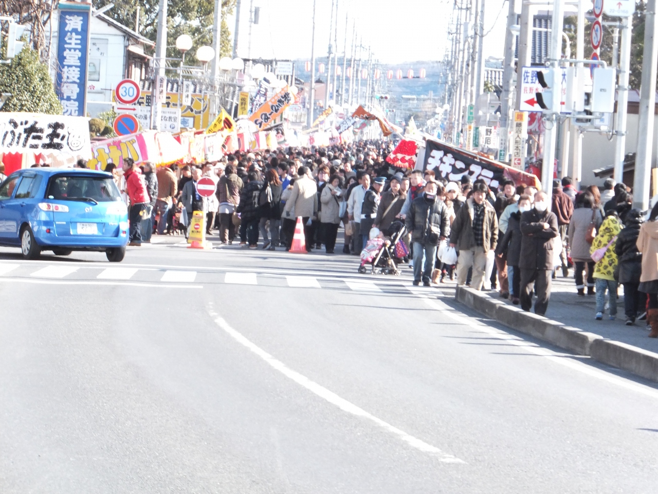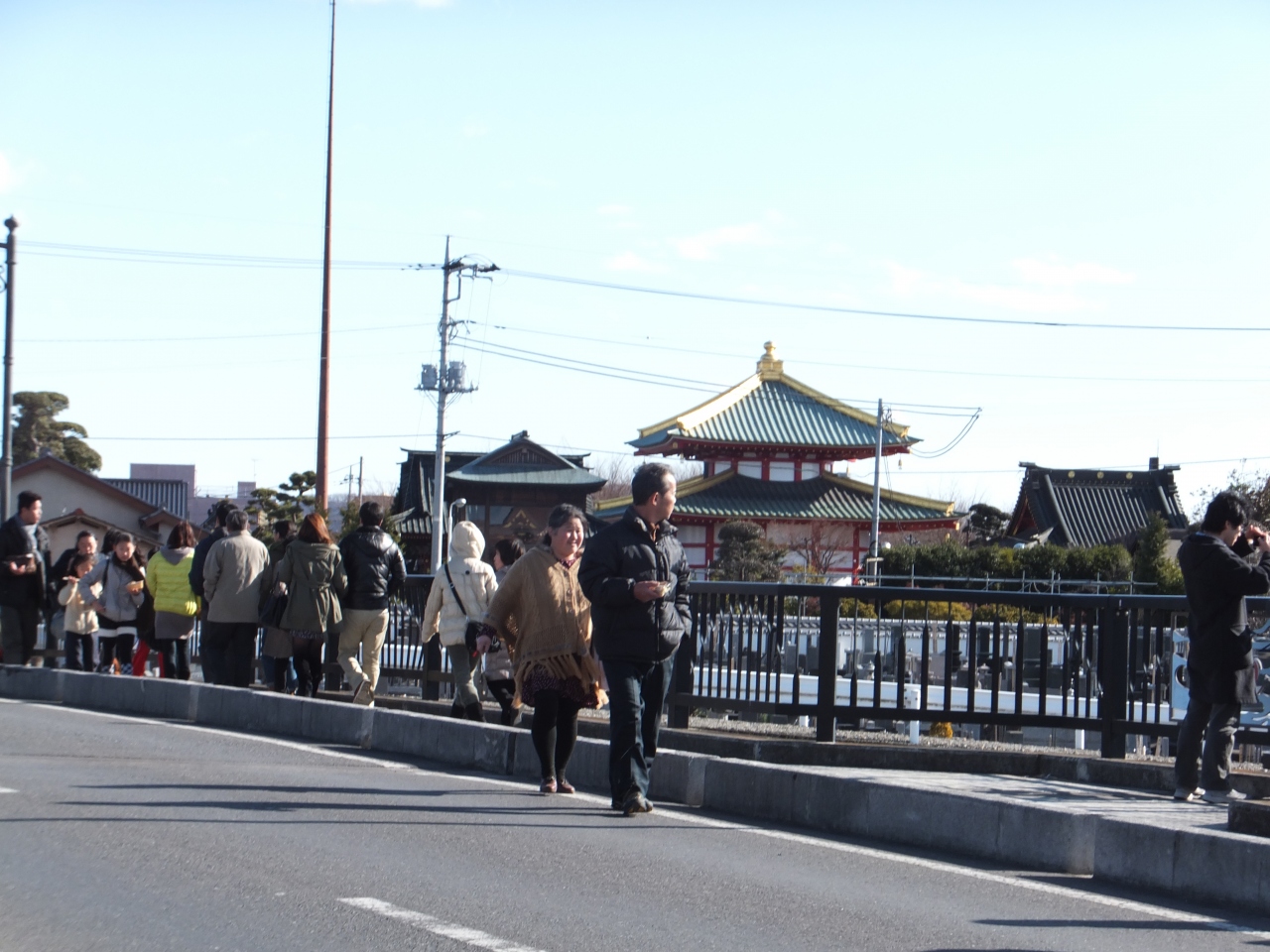正門西側の大通りミニストップのある交差点に大きな看板あり。その看板どおり西から東に通りを行くと川を渡ると参道です。川の手前に駐車場があり、無料の駐車場は川沿いを入ったところにあったと思います。が、ツアーのバスは手前のミニストップで徒歩でしたが、歩いても参道までは5分足らず。川を渡ると道の両側に1.5キロくらいで店が並びます。正門を入って左には 祈祷をお願いする方が列を成し、右手にはお参りする人の列。その手前には甘酒や焼き鳥などの出店と座って飲食するための大きなテントが。