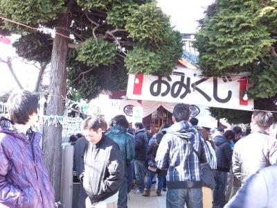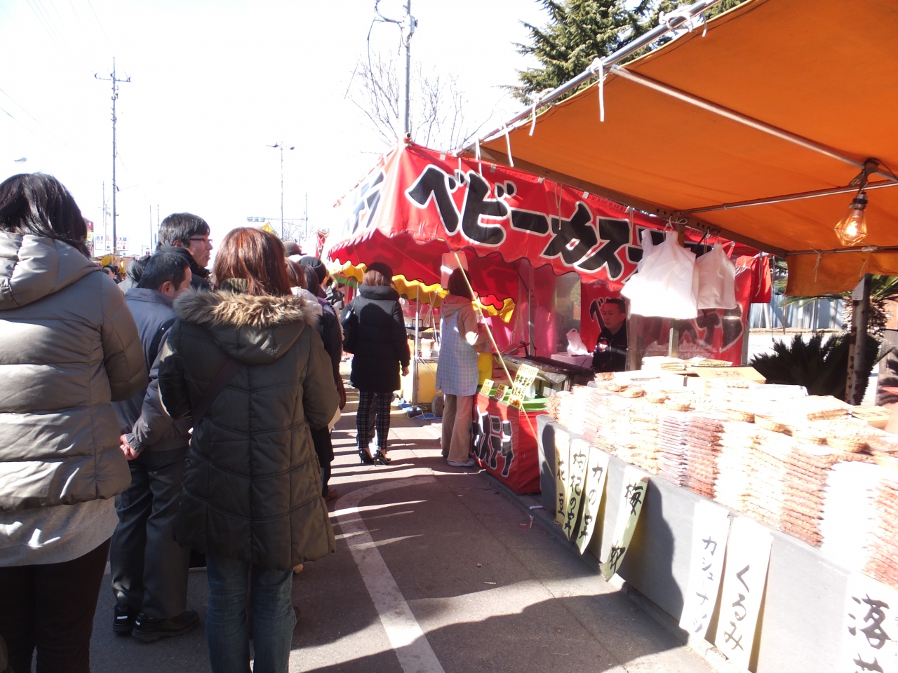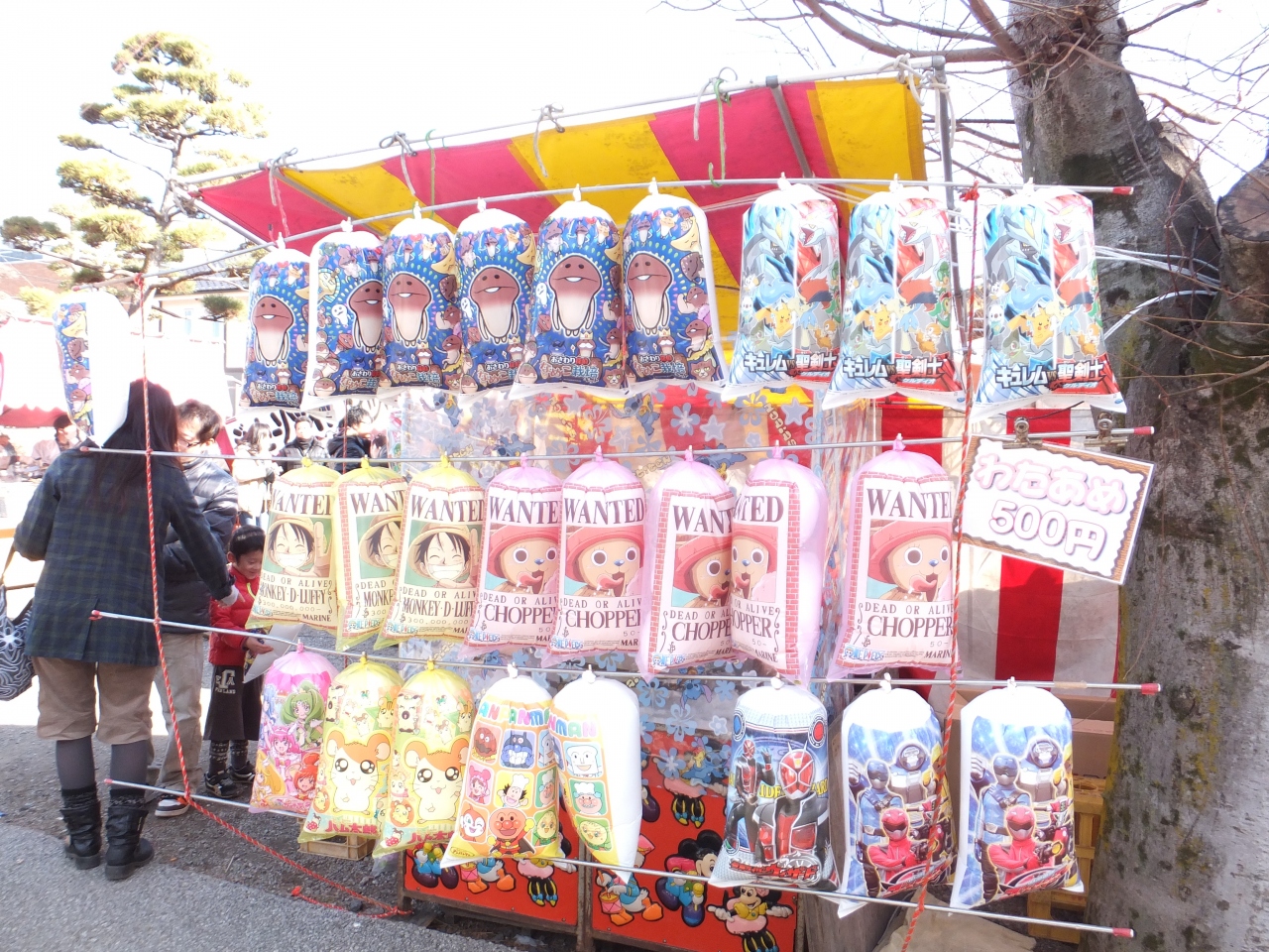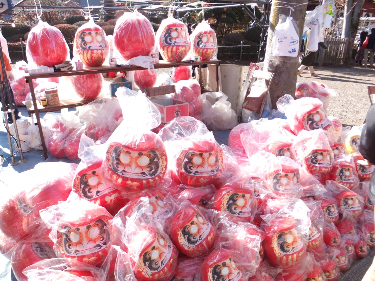 中にはだるまを売る店が3件ならんでいます。同じ製造元のだるまを違う店が並んで売っているのは面白いですね。 今、流行のなめこのキャラクターのわたあめを売っている店の左にはおみくじが。たくさんの人でにぎわっていました。出口付近にはお守りや破魔矢が売られています。