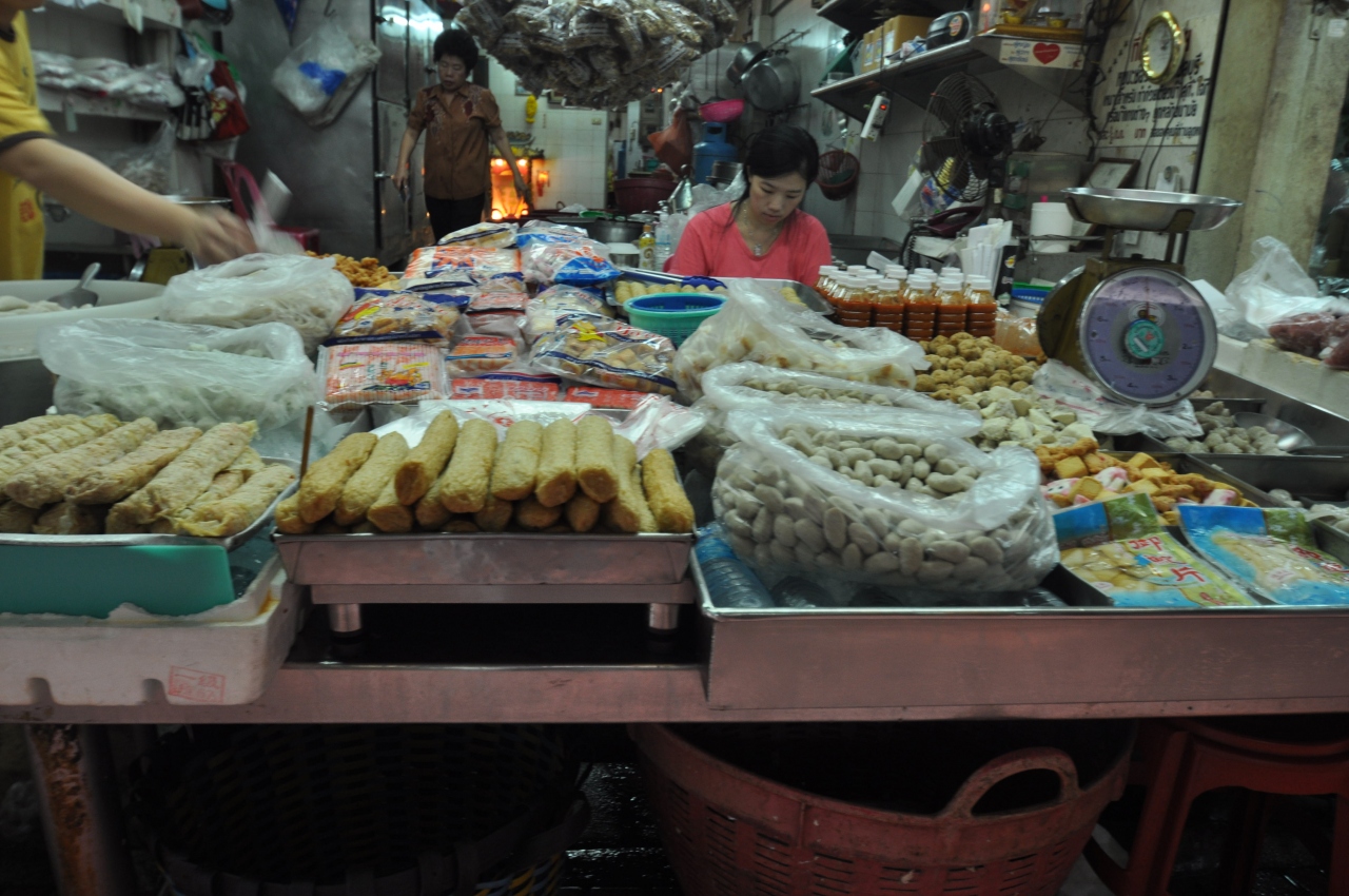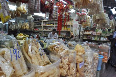 MRTファランポーン駅1番出口を出るまでは良かったが大雑把な地図しか持たなかったためか自分が方向音痴なのか気がつけばチャオプラヤー川に出てしまい川向こうにミレニアムヒルトン。西に向かうところ南にきてしまった。すっかり疲れトゥクトゥクに乗りヤワラート通りと告げる、解ったのか解らないのかぐるぐる回ってそれらしきところに到着40B払うが完全に方向が解らなくなった。それでも歩くうち目的の新市場と思われるところにたどり着いた。人混みをよけ、荷車をよけてホタテの貝柱、干しエビなどを買いカオカームーを食べるべくカームーティーサームを探すが全然解らず引き返しHua Seng Hongでフカヒレを食べる。これもコラーゲンと慰める。歩き疲れタクシーでファランポーンに帰ろうとしたら乗車拒否、仕方なく歩くうちこぎれいなマッサージ屋サンがあったので入店、2時間400B、疲労回復したので帰り際駅の方向を聞いてみたら自分の思いと全く逆。でも10分くらいというので歩きはじめ途中で店頭に座っているお姉さんに確認しながら20分くらいで漸くファランポーン駅が見えてきた。今もってよく分からない。すご過ぎるだろうチャイナタウン。