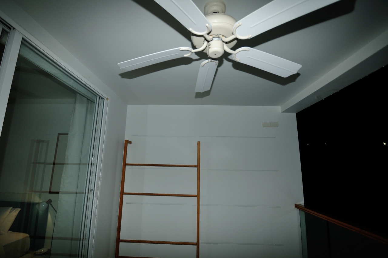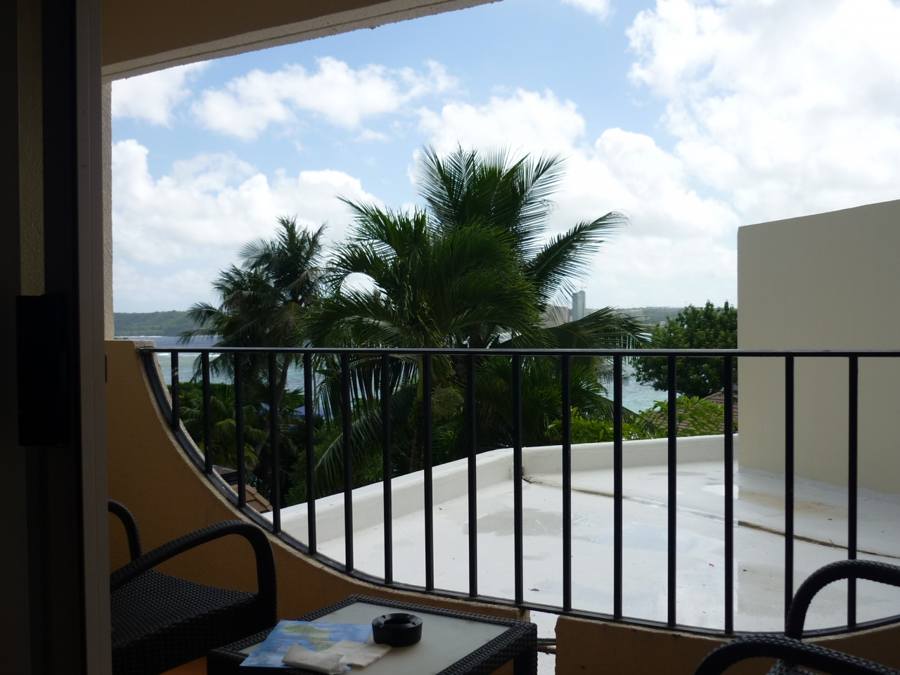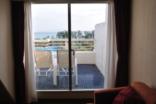 宿泊したのは4階408号day dream deluxeプールビュウーで海は少し見える程度だがバルコニーは広く前を遮るものもなく、クッション付きのベンチもあり天井の扇風機を回しながら横になっていると本当にリラックスできる。またここに物干し用の木枠がありとても便利。そして室内とバルコニーの間はエアコンを利用したエアカーテンになっている。