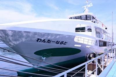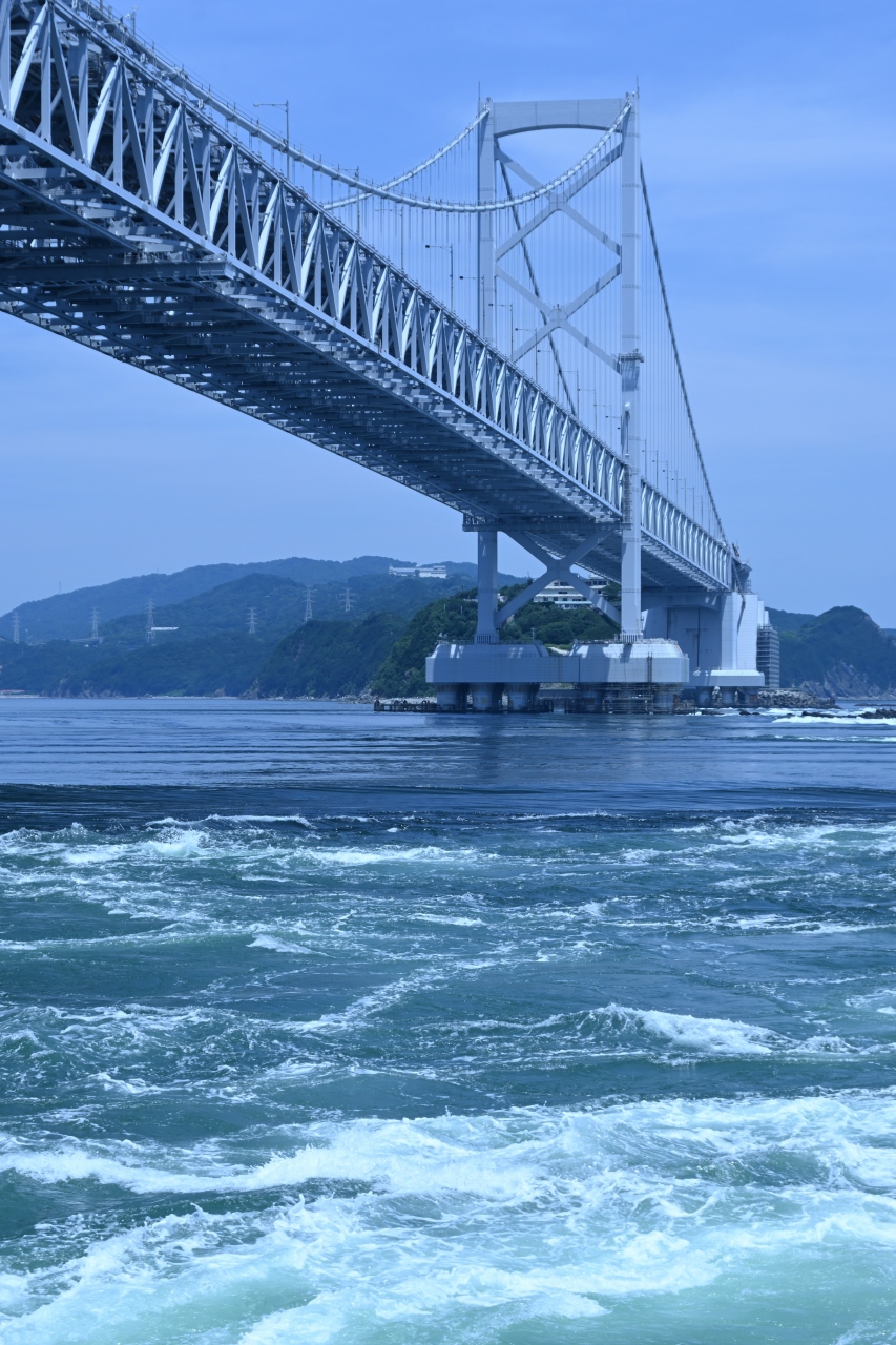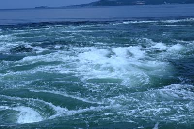 うずしお観潮船「わんだーなると」に乗りうずしお見学に行きました。この船は大型船で定員395名です。運賃1800円間近で見る鳴門海峡の渦潮は迫力がありました。できる限り観潮船会社のホームページで、渦潮の最適時間を調べてから行きましょう。大潮以外はかなり迫力が落ちるそうです。ゴーゴーと大きな音を立て流れ、渦巻く光景は想像以上の物でした。小型のボートも沢山います、迫力は小型船の方が上かもしれません。丁度この日は晴天無風で波一つ無い中、ここの渦潮部分だけ白波が立ち轟音と共に渦巻く様子は不思議な感動を覚えます。鳴門大橋からもガラス越しに見えるところがあるそうですが、1度は船で間近で見ることを勧めます。
