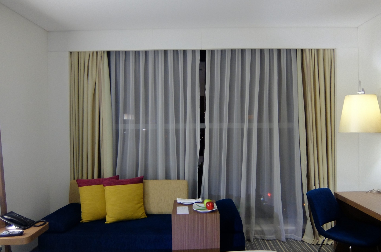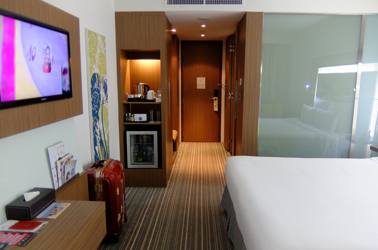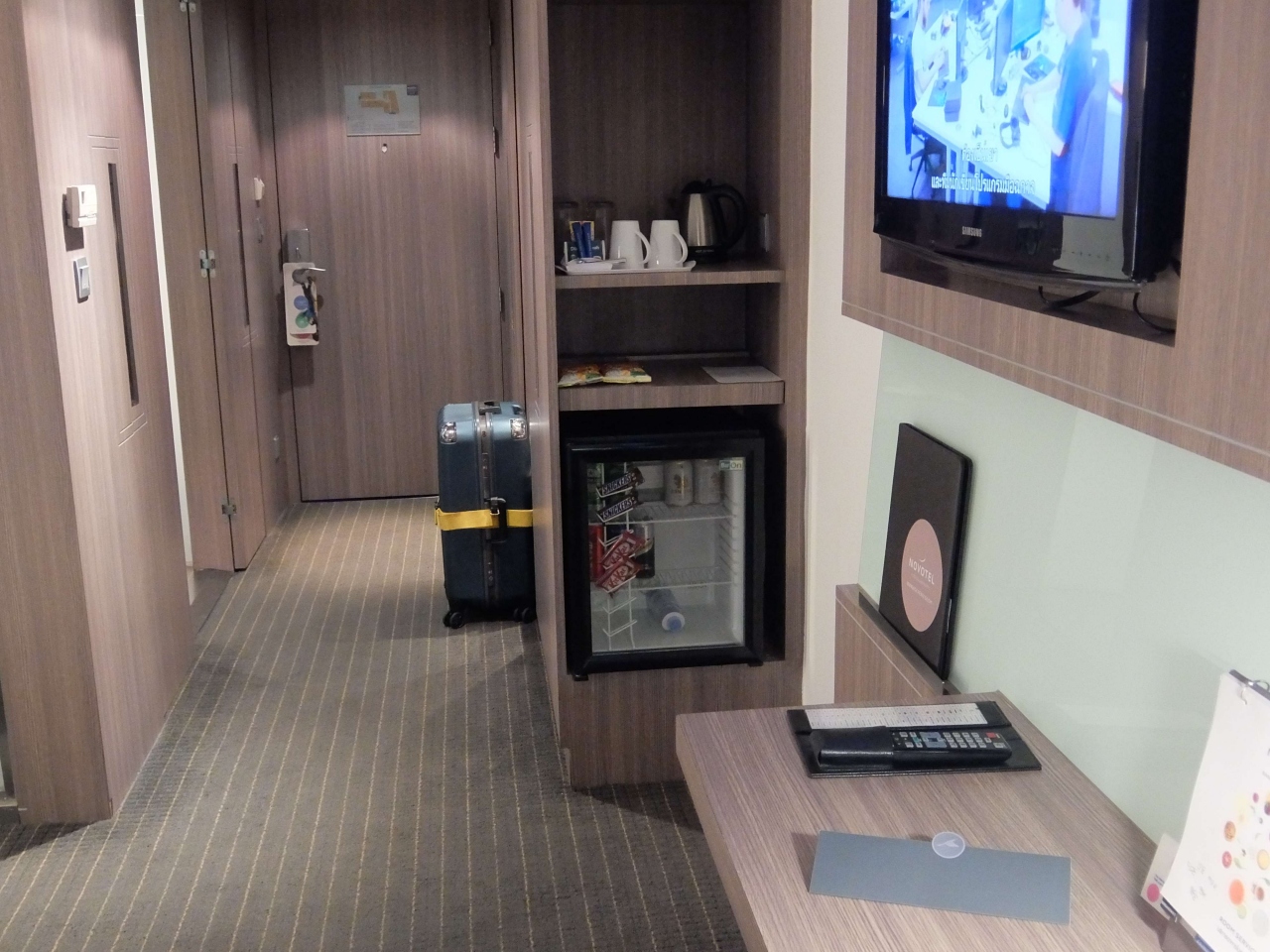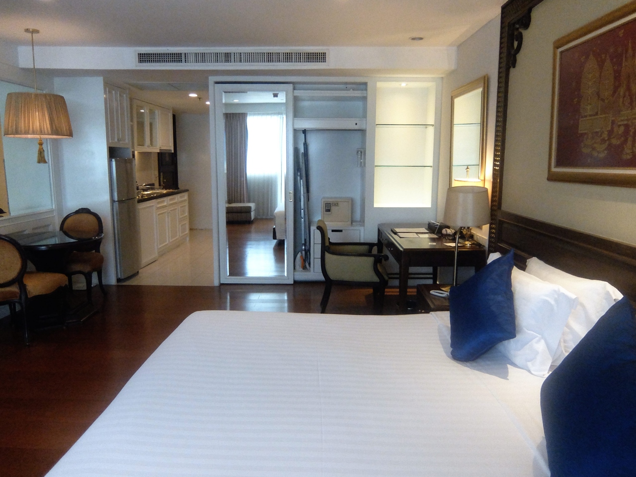 デラックスリバーサイドビュー917号室に宿泊。エレベーターホールから廊下までとにかく全てがゆったりしています。部屋のキッチンには電子レンジ、大型冷蔵庫、食器類が備わっていてベッドルームもバスルームも広く明るく、4星のシティホテルでこれだけ全てがゆったりしているのは珍しいかもしれません。Wi-Fiも問題なく利用できました。