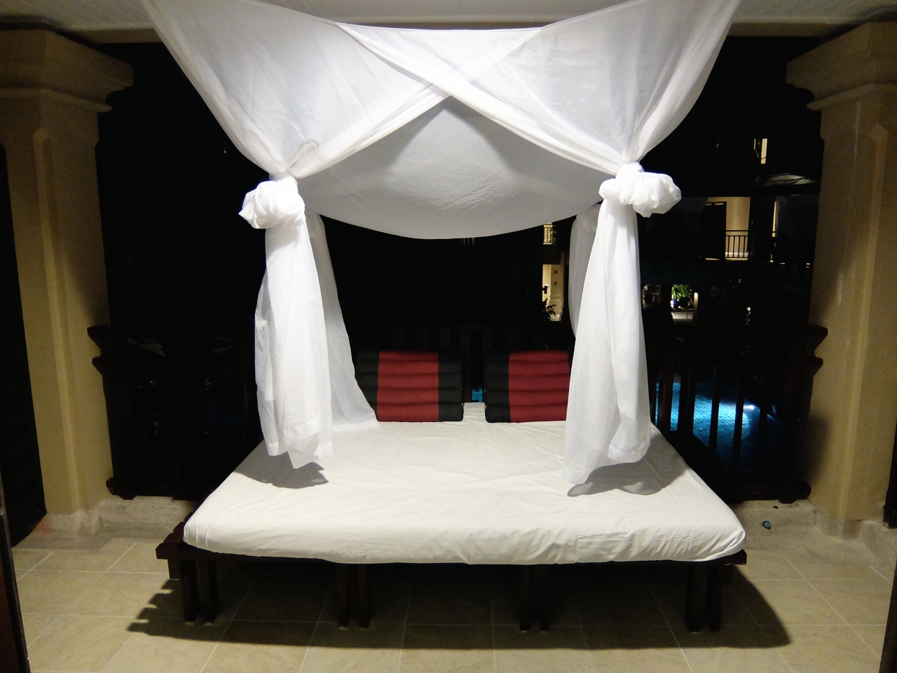 バルコニーはレースカーテンの付いたベットが唯一目を引き、物干し台もあり便利。