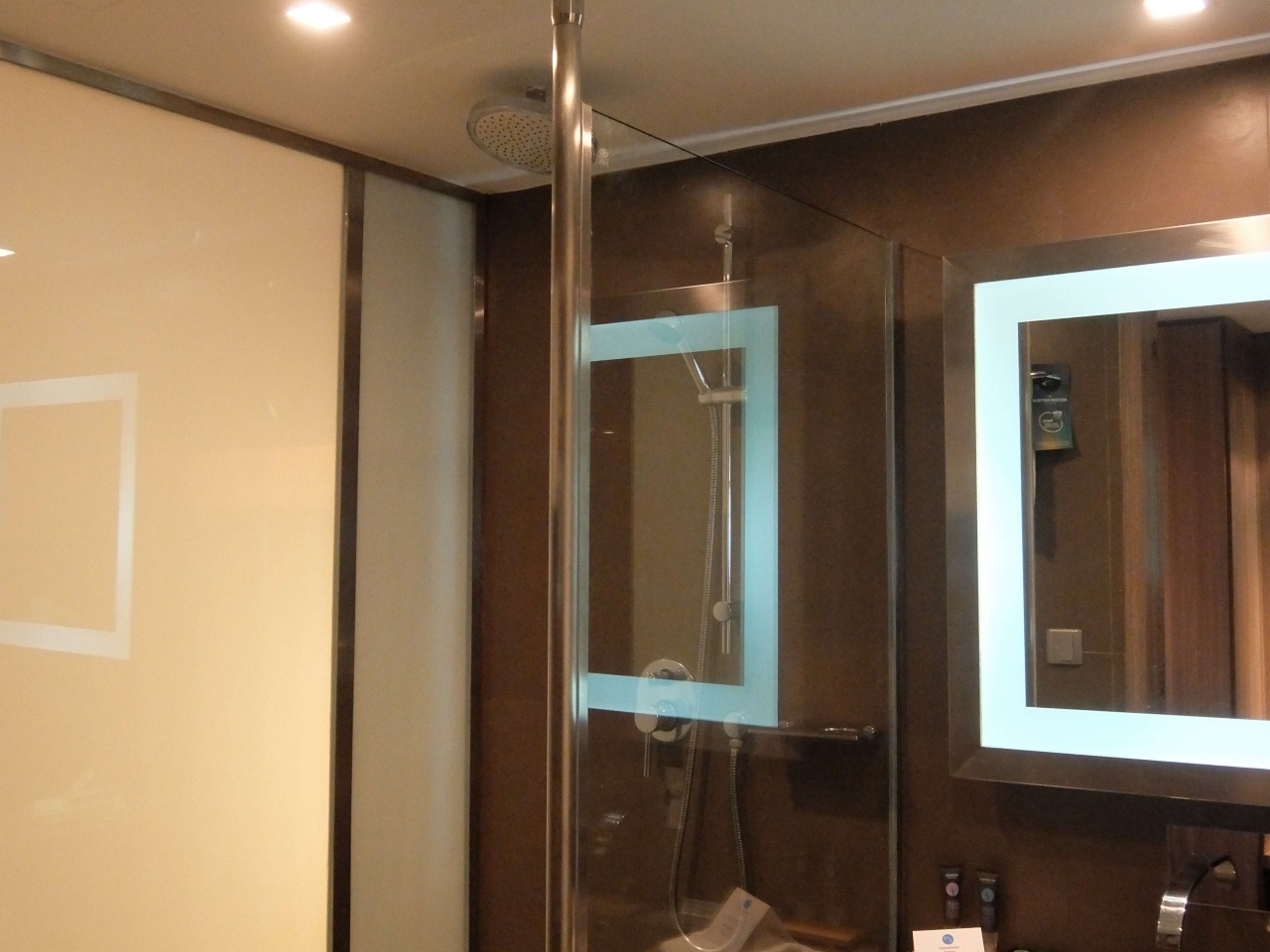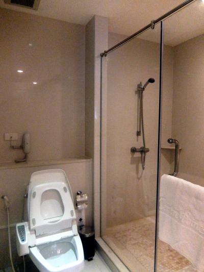 バスルームは洗面台、バスタブ(固定シャワー)、トイレ(ウオシュレット付き)が一体で仕切りはなし。シャワーの水量十分で温度変化もなく排水も問題なし。但し部屋は綺麗に清掃されていたがバスタブの清掃は完全に手抜き。