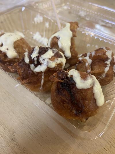イオンの看板が見えたので行ってみたら、『ハロー』というショッピングモールの中にイオンや、専門店が入っているようでした。大きい無料の駐車場がありました。ちょぼたこという、たこ焼きのお店で、揚げたたこ焼きを頂きました。