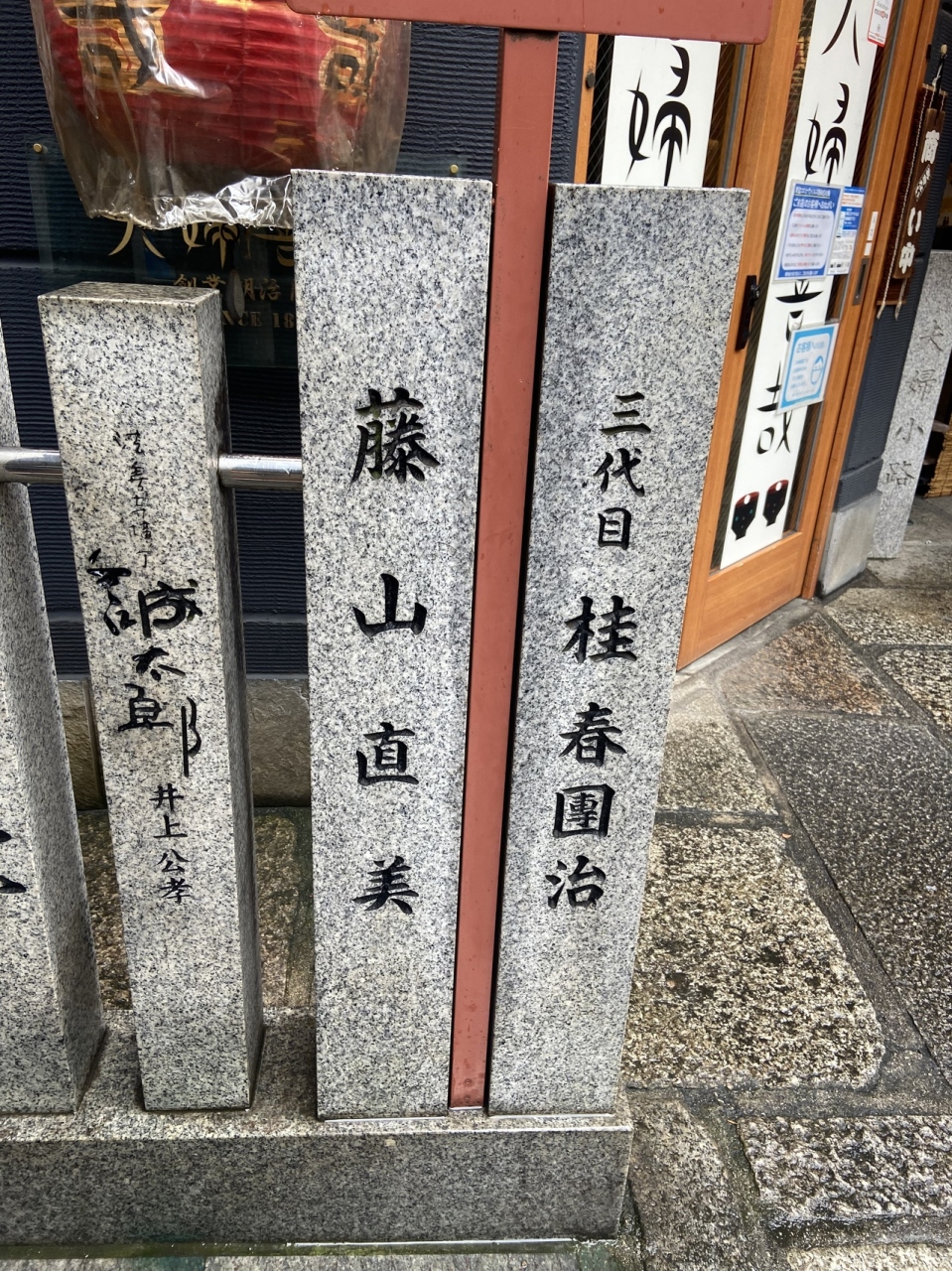 ミナミの繁華街にある法善寺さんです。小さな場所は水掛不動さま、金毘羅堂などがギュッとある浄土宗のお寺です。その周りには有名な法善寺横丁、織田作之助の短編小説で有名な夫婦善哉のお店などがあります。石碑には藤山直美さん、桂春団治さんといった大御所の名前がありました。
