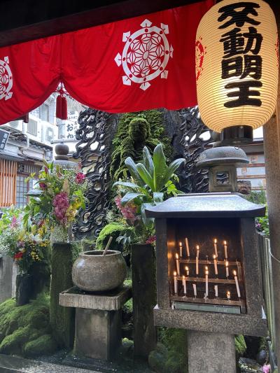 ミナミの繁華街の一角にあるので、お参りの人が絶えません。参拝する人が下に置いてあるバケツの中の水をひしゃくでかけるので、お不動様や、その周りの石像なども全部苔がたくさん生えています。隣には新型コロナウィルス感染症消滅の願いが掲げてありました。