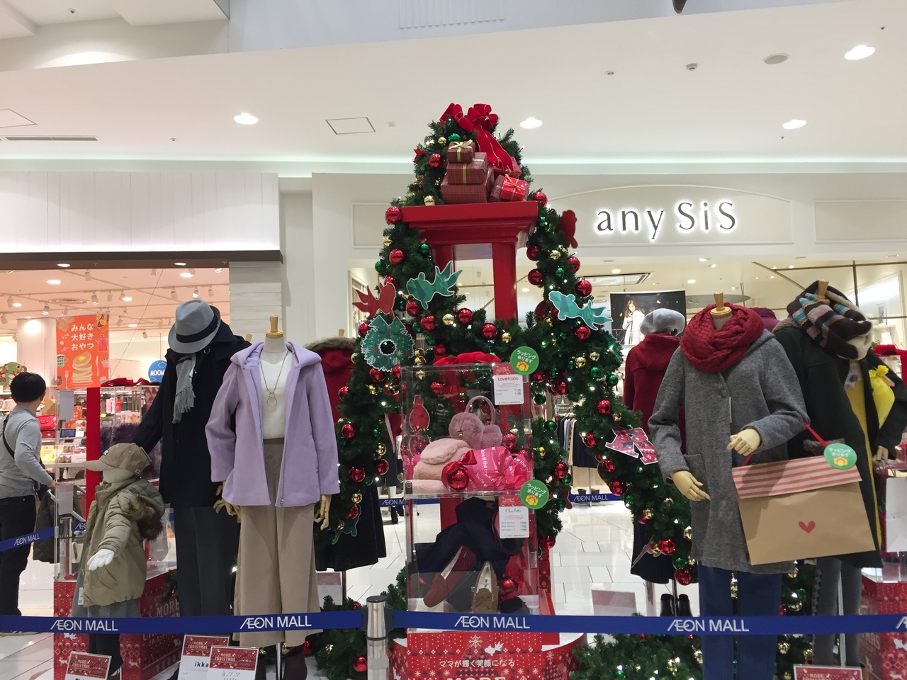 イオンモール大和郡山はかなり大きな駐車場が無料です。近くに駅がないので、バス(JR郡山駅か、近鉄郡山駅、近鉄奈良駅から)か自家用車利用でないとこれません。金魚の産地の郡山らしく、金魚のオブジェがあり、クリスマス仕様になってました。奈良のお土産コーナーがあり、銘菓や、地酒があってました。