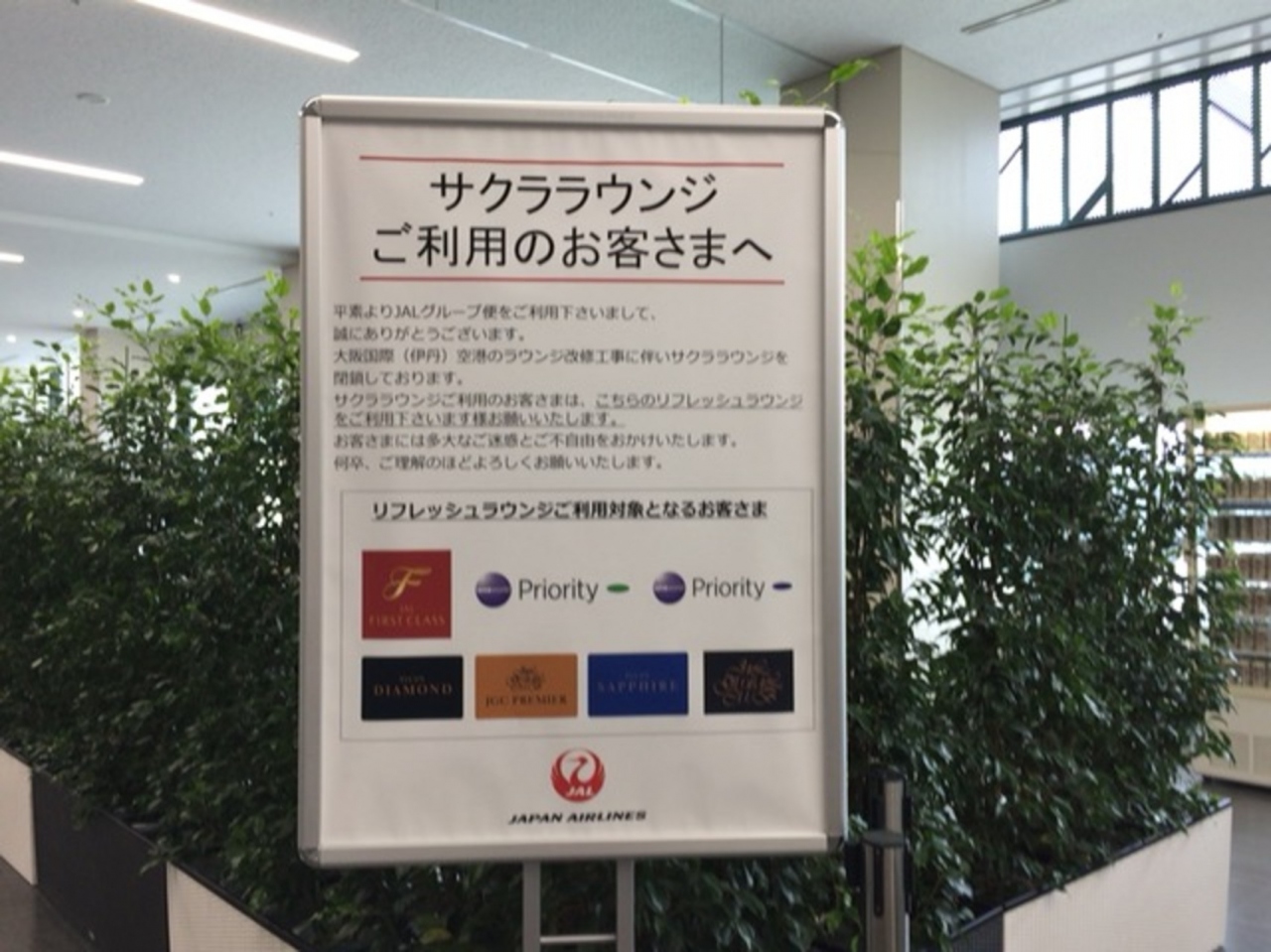 伊丹空港2階にある 仮のサクララウンジのリフレッシュラウンジです。廊下に 植木で目隠しをして、元のサクララウンジで使ってたソファの一部も使われてきました。限りなくオープンスペース感が有ります(苦笑) ビールサーバーとかはなく、缶ビールやペットボトルの飲料のサービスでした。