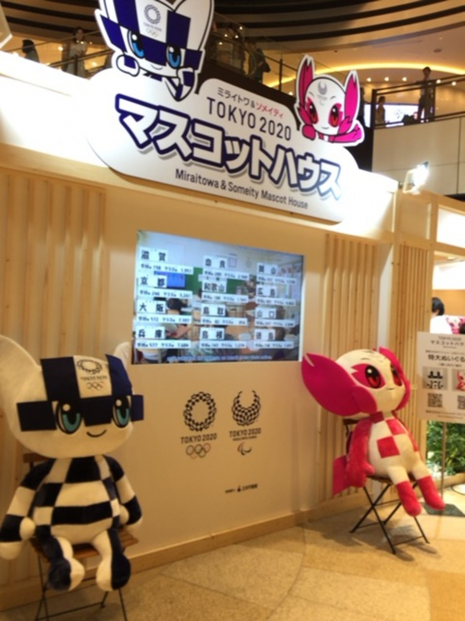 ミッドタウン日比谷の1階に 東京オリンピックパラリンピックののマスコット [ミライトワ]と[ソメイティ]のマスコットハウスが 9月6日まで開催中です。ミライティとソメイティと記念撮影ができるようでしたが、並んでいたので次回に。ぬいぐるみ、クリアボトル、Tシャツなどのグッズも販売されていました。
