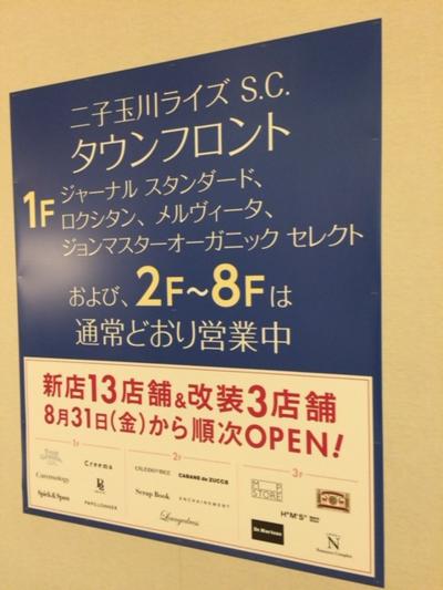 久々に二子玉川ライズショッピングセンターへお買い物に行きました。1階の真ん中が改装中でした。8月31日 新店13店と、改装3店舗がオープンするらしいですので、楽しみですね。ここは、妊婦さんや、子連れの方の優先エレベーターが有り 優しいショッピングセンターだと思います。