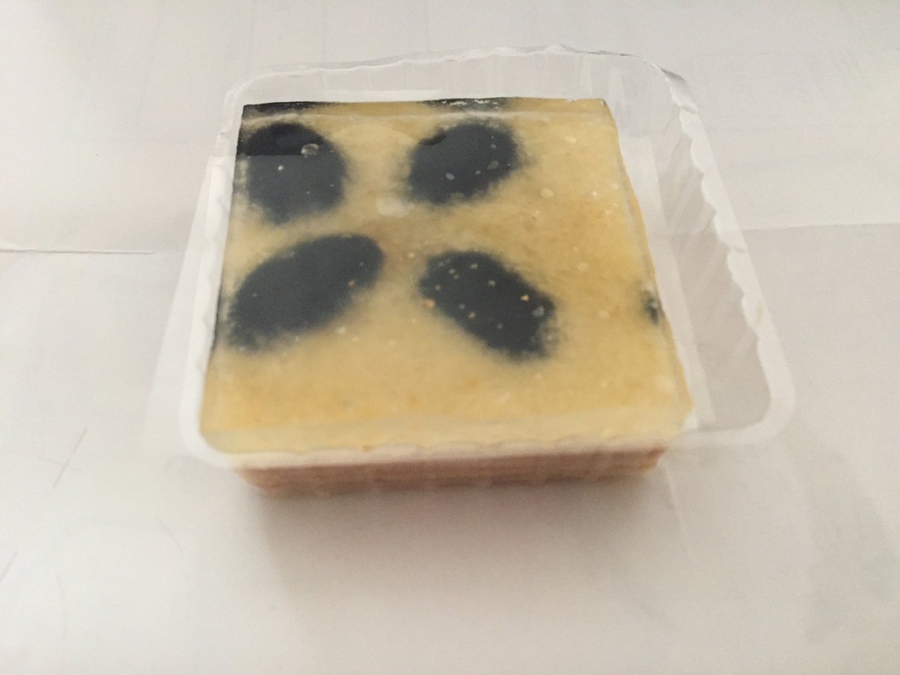豆の形の白い髪の箱に 季節ごとや、定番の美しいイラストが書かれている豆菓子で有名な 金澤萬久さんで見つけた 夏らしいお菓子[わらび餅のバウム]下の方がバームクーヘンで、上の方がプルプルのわらび餅[四角いシートみたいになっていて わらび餅という感じでは無い) の中に甘い黒豆が入っていました。食べたことのない組み合わせで 面白かったです。