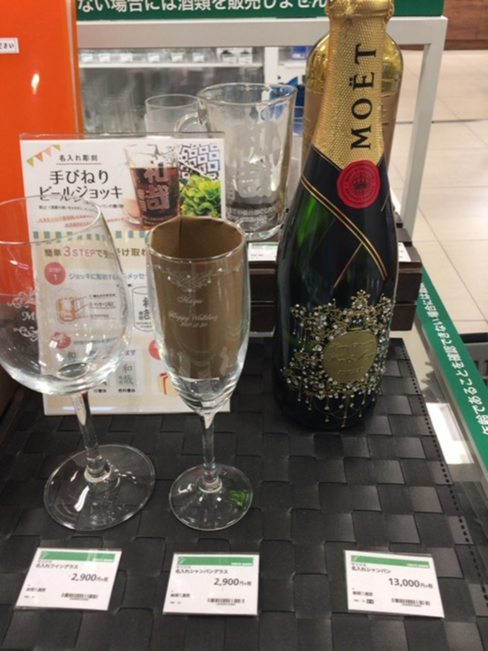 横浜モアーズの5階から7階 が東急ハンズになってます。ブラブラ店内を見ていたら、ネームを入れてくれる色々な商品が有りました。例えば シャンパンにスワロフスキーみたいなキラキラと名前、焼酎のボトルにネームを入れたもの、ワイングラスや、シャンパングラスにネームを入れたり オリジナリティーのある商品で、何か記念の時にお願いしたいと思います。